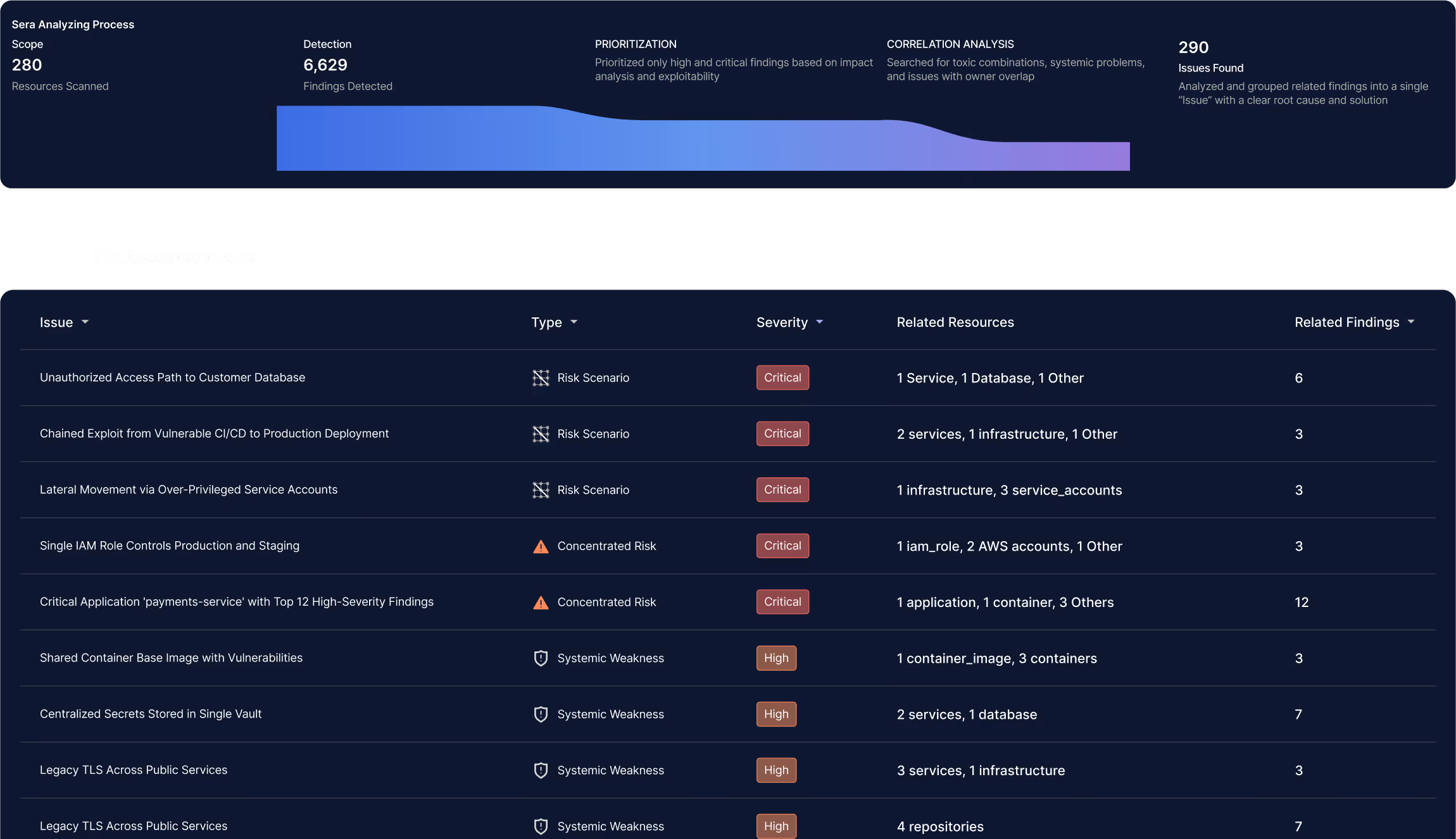 Other AppSec tools analyze each scanner finding individually. Sera correlates findings with each other and their environment to detect toxic combinations, systemic risks, and high-risk code repos and cloud resources.